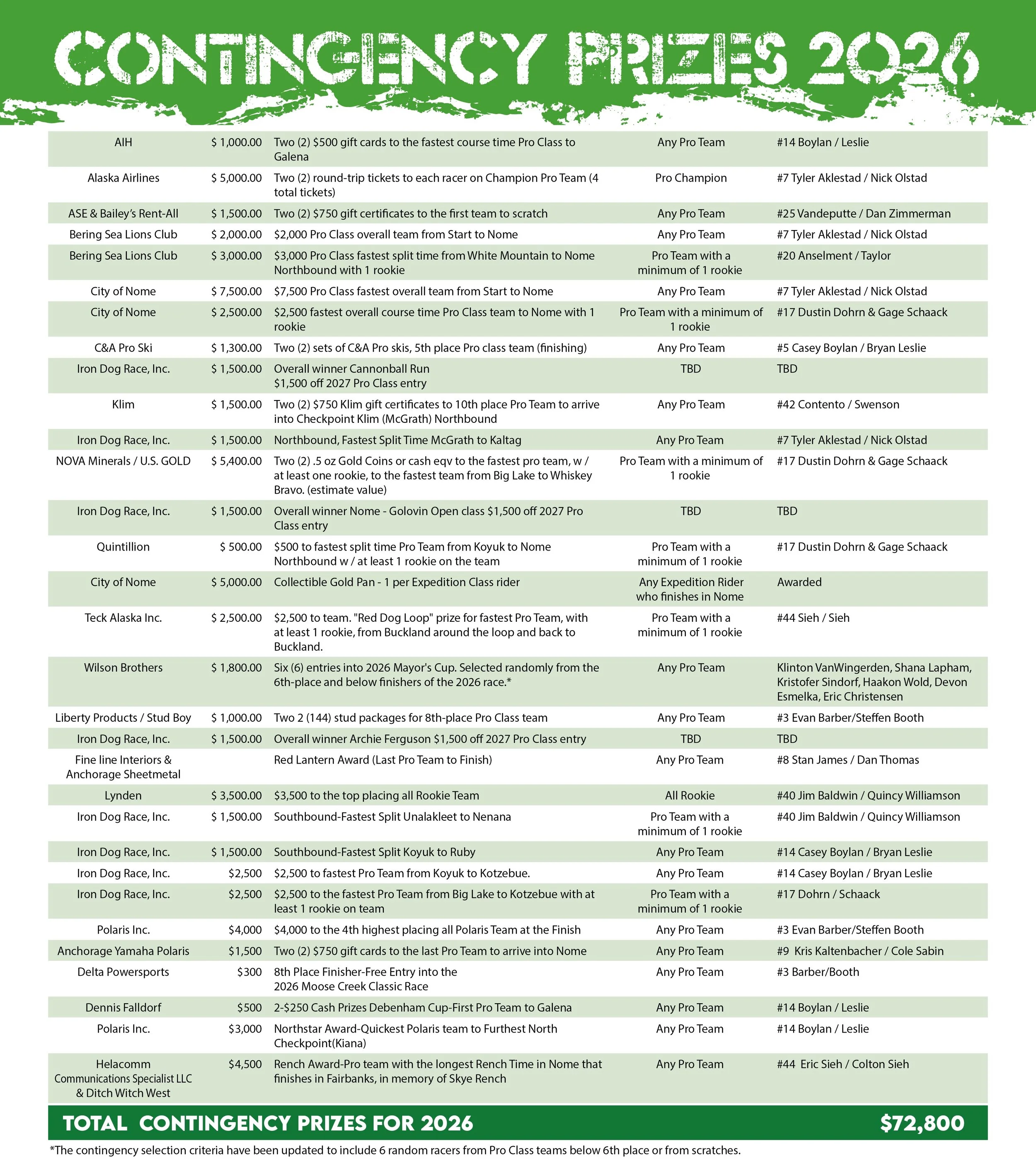 The 2026 Iron Dog Race has officially paid out $200,000 in Pro Class purse money, along with more than $72,800 in contingency prizes.