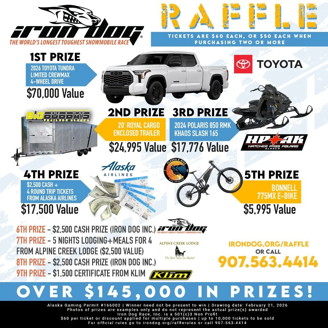 Congratulations to all of our winners, and thank you to everyone who purchased tickets and supported Iron Dog this year. Your continued support makes this race and its community programs possible.